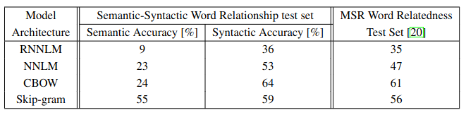 CBOW 모델과 비교해서 Skip-gram 모델이 구문론적 정확도에서 약간 떨어지지만 의미론적 정확도에서는 다른 모델들 보다 더 좋은 결과를 보임.