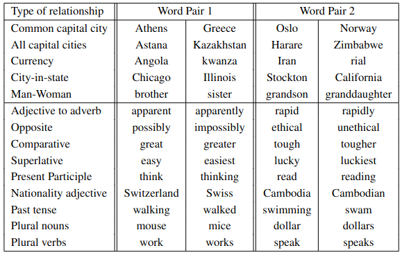 5 종류의 의미론적 단어 관계, 9 종류의 구문론적 단어 관계 테스트 데이터 예시